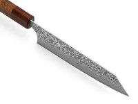 -Zwinge, gewachst, achteckig geformt, liegt perfekt in der Hand. Sofort wird der Wunsch wach, die Damastklinge ihrem eigentlichen Zweck zuzuführen. Die ca. 170 mm lange Klinge, eine sehr gute Länge für das schöne Kochmesser, wurde aus SG2 Stahl und vielen Schichten Damaststahl gefertigt. Der renommierte Stahlhersteller Takefu Special Steel bezeichnet den Stahl als Super Gold 2 (SPG2). Es ist ein pulvermetallurgischer, rostfreier Stahl mit einigen Besonderheiten. Messer-Schmiede und Messer-Liebhaber schätzen besonders die homogene, feine Struktur, den hohen Härtegrad von 63