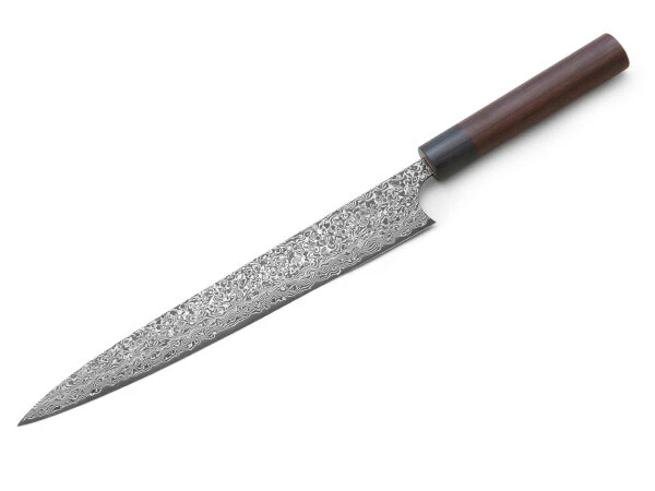 Sushi- und Sashimimesser von Yoshimi Kato in der edlen Damast-Ausführung Kurosome. Ein wunderschönes Filetiermesser mit stolzen 27 cm Klingenlänge. Das mächtige Messer liegt sehr gut in der Hand und lässt sich mit etwas Übung hervorragend führen. Als Damastmesser ist das