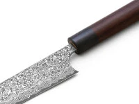 noch etwas dünner, hat einen kleineren Winkel und bringt rund 25 g weniger Gewicht auf die Waage. Ein wahres Schmuckstück in der Küche. Die Messer der Serie Kurosome sind aus VG-10 Edelstahl und 30 Lagen Damast mit brüniertem Finish. Sehr schön passt der wundervolle, angenehm in der Hand liegende