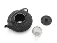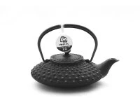 Diese hübsche, flache Teekanne aus Gusseisen von Iwachu ist ein echter Klassiker, der seinen Charme nie verloren hat. Im Gegenteil. Die wohl bekannteste Form der japanischen Teekannen ist auch eine der beliebtesten überhaupt. Das liegt vielleicht auch daran, dass sie sich in der Farbe Schwarz geschmackvoll mit klassischem Teegeschirr aus Ton aber auch kontrastierend mit Porzellangeschirr kombinieren lässt. Iwachu stellt die Teekanne Hira im einzigartigen Nanbu-Tekki Verfahren her. Seit über 100 Jahren ist Iwachu mit der japanischen Teezeremonie verbunden. Aus dieser Tradition erwuchs auch der unerschütterliche Drang zu höchster Produktqualität. Innen ist die Teekanne emailliert. Ein rostfreies Edelstahlsieb sorgt dafür, dass sich der Tee in bester Manier entfalten kann. Die Größe der Kanne ist perfekt für 2-3 Tassen Tee pro Aufguss. Iwachu ist für Schadstofffreiheit zertifiziert, alle Rohstoffe und Materialien sind durch Iwachu auf Schadstoffe getestet.