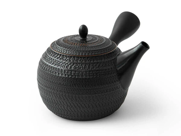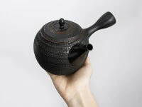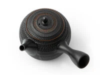 von Gyokko aus Tokoname mit integriertem Keramiksieb. Diese japanische Teekanne wurde vom Meister selbst aus natürlichem Ton von Hand auf der Töpferscheibe gefertigt. Gyokko ist einer der bekanntesten Meister dieser Kunst. Er verwendet ausschließlich natürlichen, mineralstoffreichen Ton aus Tokoname, der bei hohen Temperaturen gebrannt werden kann. Seine sehr detaillierten Muster sind oft Vorlage für Kopierversuche, was in Japan als großes Kompliment gilt. Die schöne Teekanne wiegt ca. 280 Gramm und fasst ungefähr 580 ml. Sie ist sehr gut mit den schwarzen Teeschalen von Meister Gyokko kombinierbar.