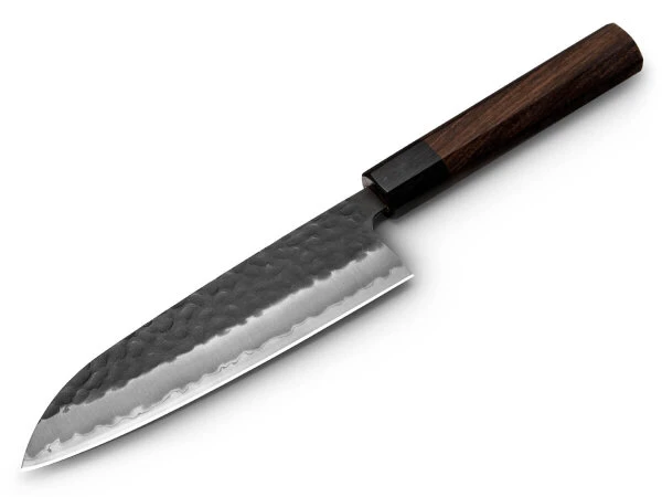 -Klinge ausgestattet ist. Kiritsuke bezeichnet die typische Form dieser Sakai-Messer mit ihrer ausgeprägten Spitze. Damit sind die Messer prädestiniert für Einstechen, Schlitzen und lange, gerade Schnitte. Die größeren Messer können wir ein Sushi-Messer verwendet werden. Insgesamt erweitert die Form Kiritsuke als den Anwendungsbereich erheblich. Die Messerserie Kureta hat Klingen aus dem berühmten Aogami super Stahl, schwarz geschmiedet und poliert, die Griffe sind aus Palisander (