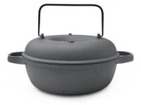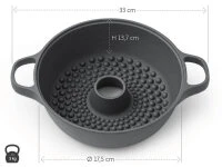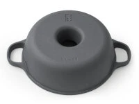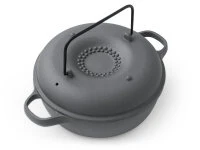 Ein Kochtopf mit Kamin-Effekt. Er ist entwickelt worden, um Kartoffeln, Süßkartoffeln, Mais und Äpfel in einer Art zu zubereiten, die an die Feuer im Garten erinnert. Die Hitze steigt durch den Kamin auf und verteilt sich gleichmäßig auf die Leckereien. So wird alles gleichmäßig gegart und duftend gebacken. Ein Rösterlebnis der besonders nostalgischen Art.