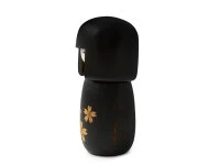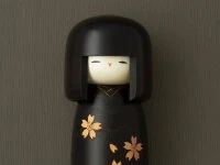 trägt einen schwarzen Kimono, verziert mit Kirschblüten. Sanft und edel schimmert die feine Maserung der verwendeten Kastanie durch die kunstvolle Bemalung. Das Gesicht hat der Künstler aus Holz des