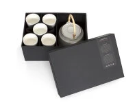Teeset, bestehend aus Teekanne und 5 Teeschalen. Design von Tatsumi Kato (ceramic japan), traditionell von Hand gefertigt, in modernem Design. Die Manufaktur hat ihren Sitz in Seto, Präfektur Aichi. Dort, wo traditionell Töpferware hergestellt wird, da diese Region mit einem besonders hochwertigen Töpferkitt ausgestattet ist. Es ist das einzige Töpferzentrum in Japan, das eine Glasur verwendet, die seit der Kamakura-Zeit, seit über 1000 Jahre, eingesetzt wird. Die vielfach prämierte Manufaktur zeichnet sich durch ihre bewusst enge Zusammenarbeit von modernen Designern mit traditionellen Kunsthandwerkern aus. Die Ergebnisse sind Produkte, die die Welt noch nicht gesehen hat. Neue Formen von hoher Ästetik aber auch höchstem Gebrauchswert und bester Qualität. Die Unterschiede zu preiswerter Massen- und Industrieware ist nicht nur sichtbar sondern – so Tee-Kenner – auch im Geschmackserlebnis deutlich erfahrbar.